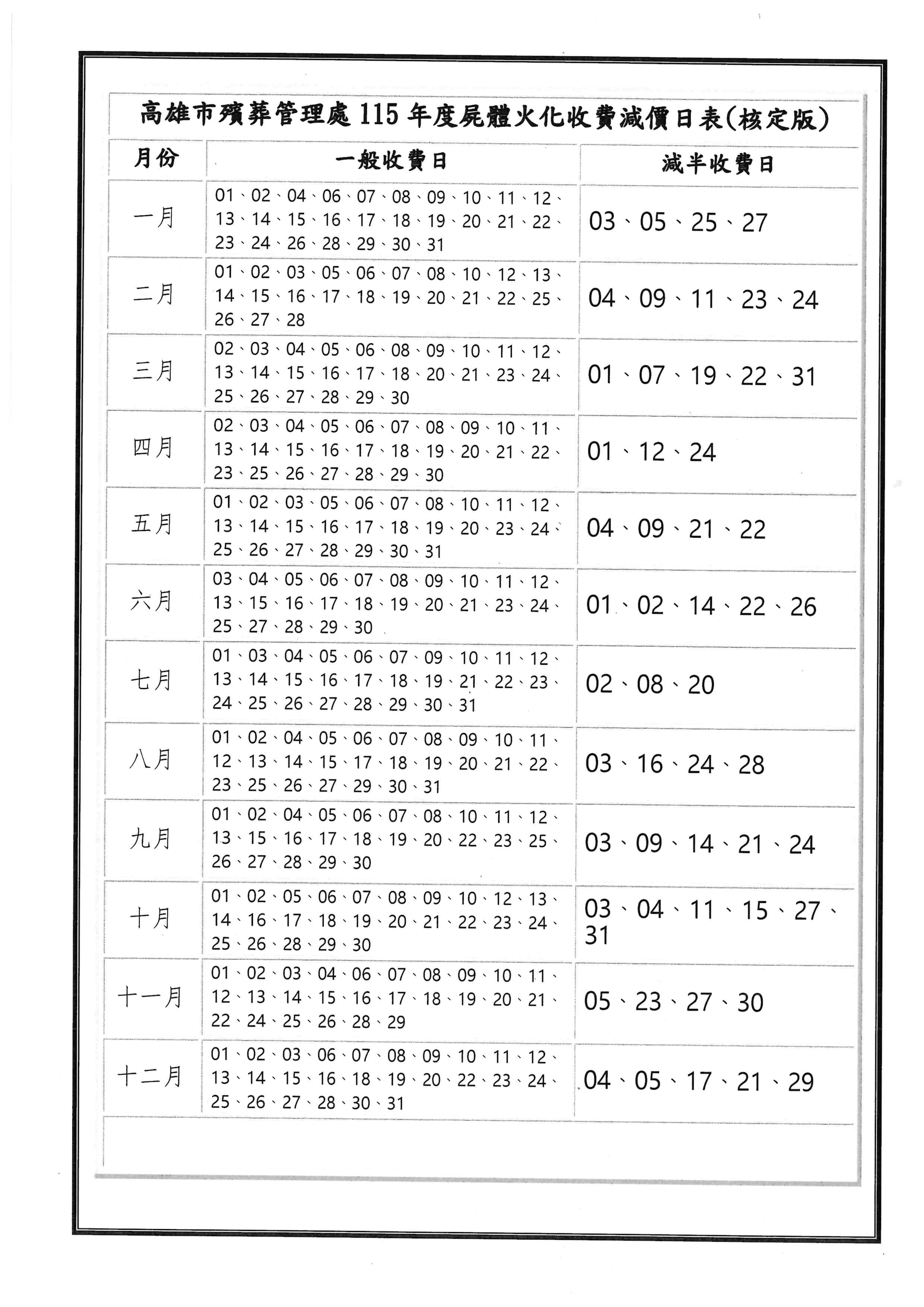 高雄市殯葬管理處115年度屍體火化收費減價日表,詳如附表!!