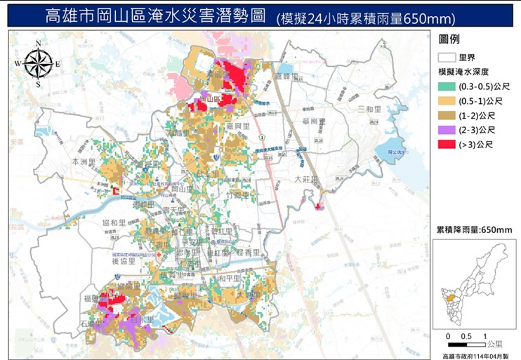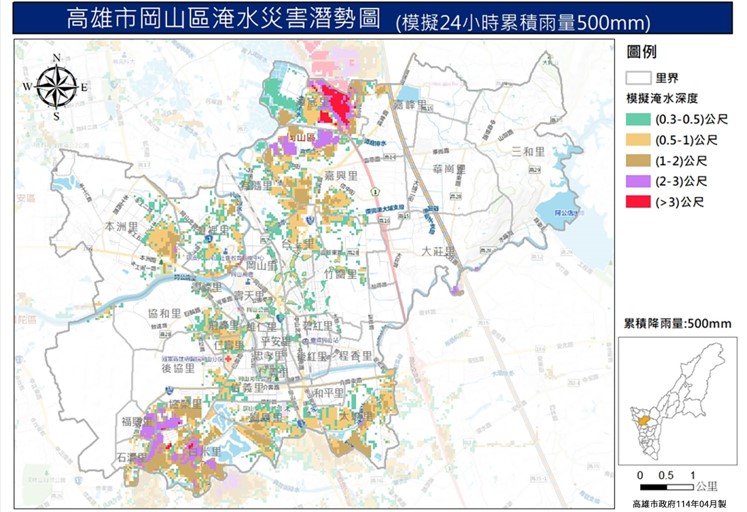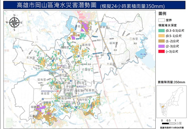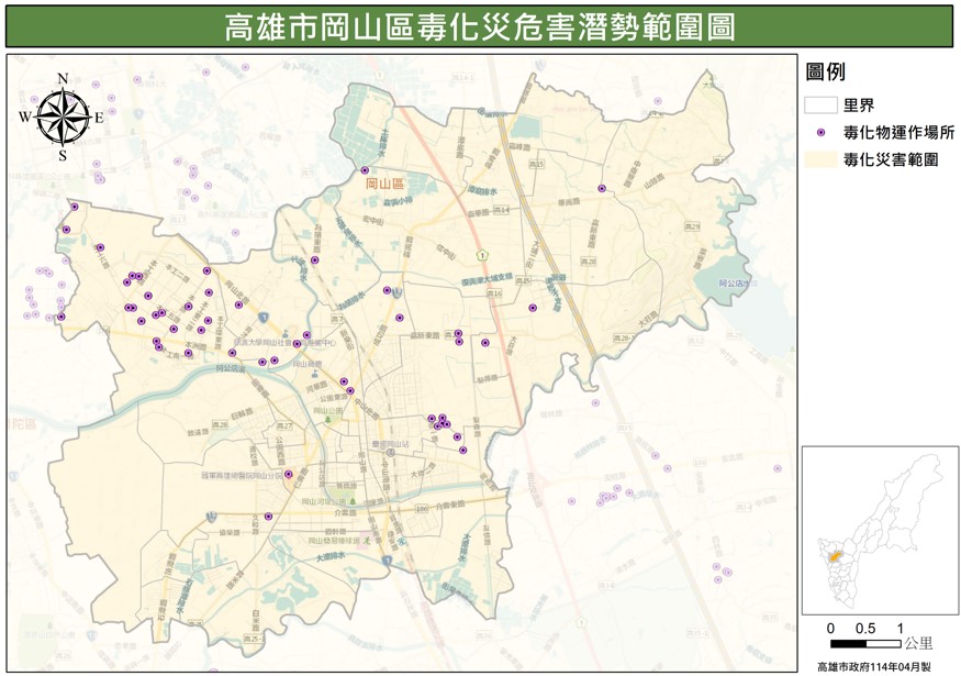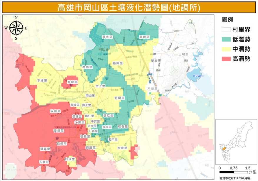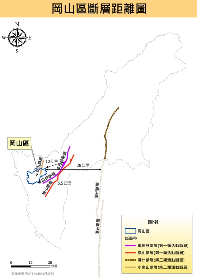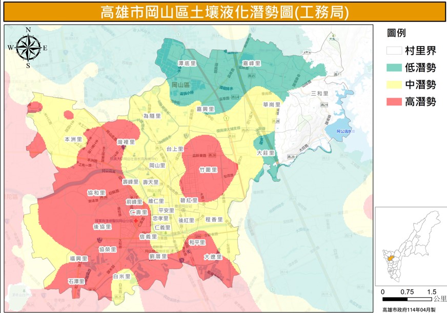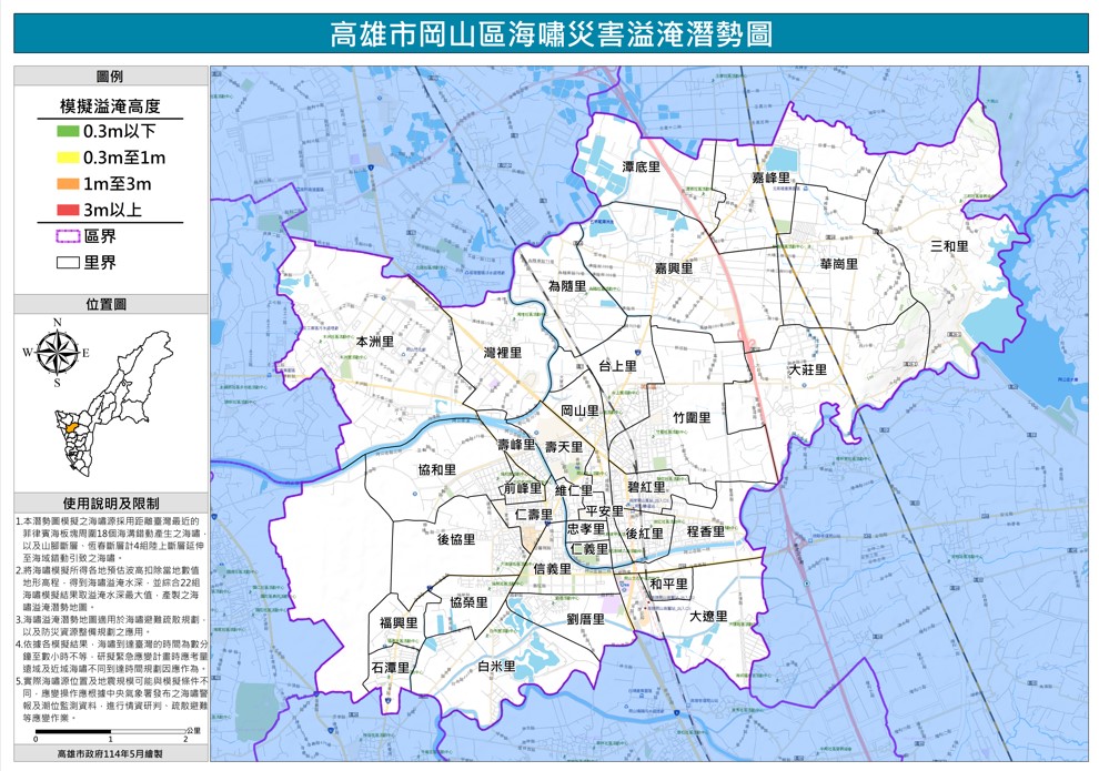 - 岡山區斷層距離圖 - 高雄市岡山區海嘯災害溢淹潛勢圖 - 高雄市岡山區土石流及大規模崩塌潛勢圖 - 高雄市岡山區毒化災危害潛勢範圍圖 - 高雄市岡山區土壤液化潛勢圖_工務局 - 高雄市岡山區土壤液化潛勢圖_中央地調所 - 高雄市岡山區淹水災害潛勢圖_350mm - 高雄市岡山區淹水災害潛勢圖_500mm - 高雄市岡山區淹水災害潛勢圖_650mm