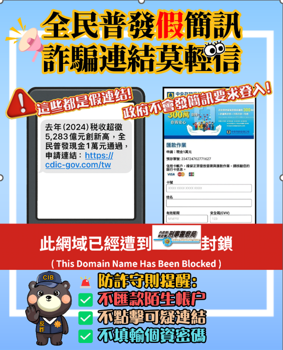 脅擴大,請民眾勿誤信「普發現金一萬元」釣魚簡訊詐騙手法。